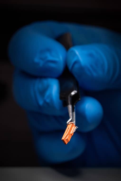The design required 0.004" (0.1016mm) walls around the electrodes. A custom tool was needed to compensate for slight electrode variability.